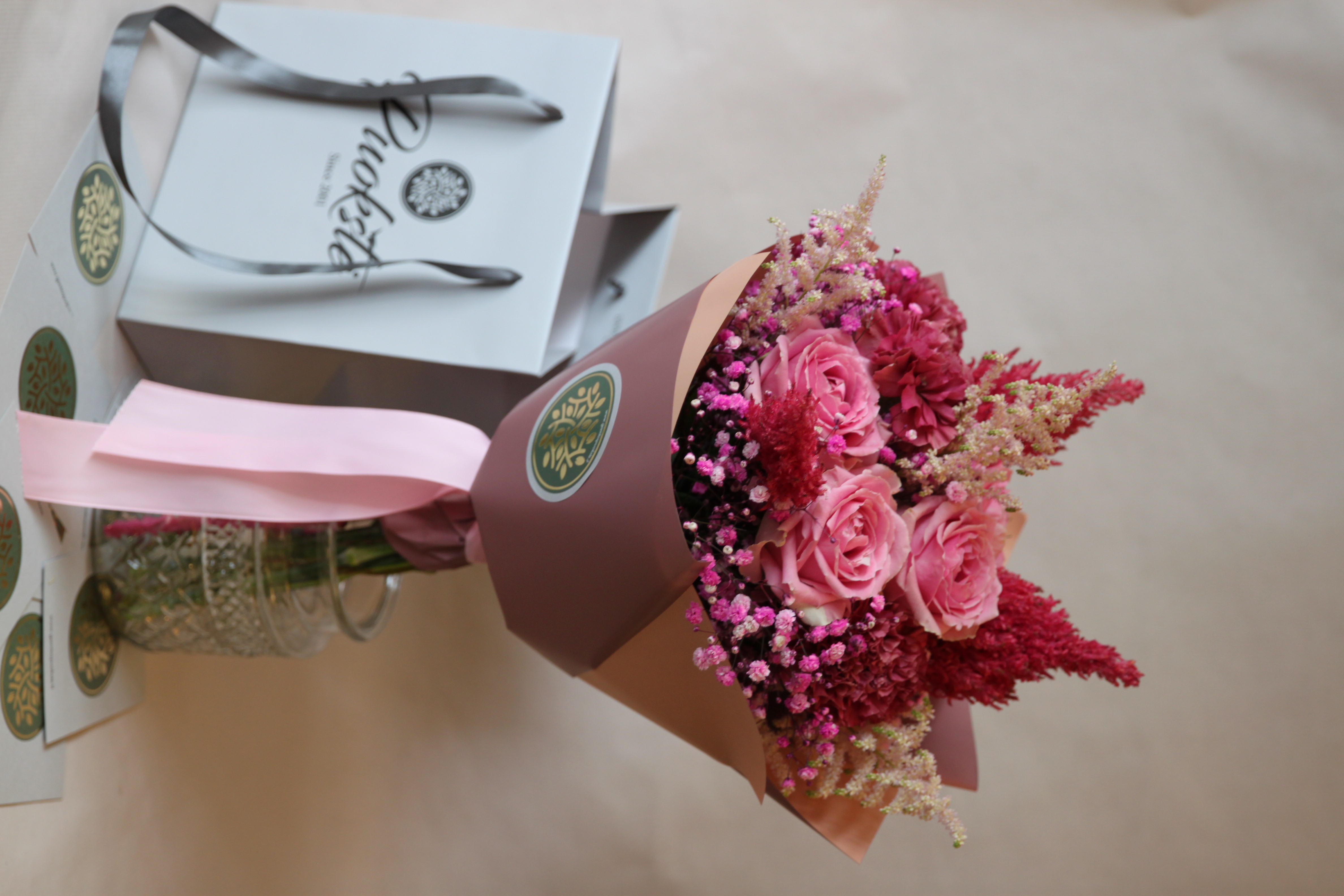 Atsižvelgiant į sezoniškumą puokštės gėlės ir spalvos gali nežymiai skirtis. Dėl turimo asortimento skambinkite telefonu +370 462 40358.